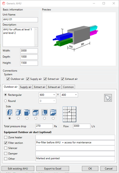 MagiCAD enables you to create generic air handling units (AHU). Generic air handling units can be used as place holders to ensure sufficient space for the equipment in technical rooms before more detailed product information is available.