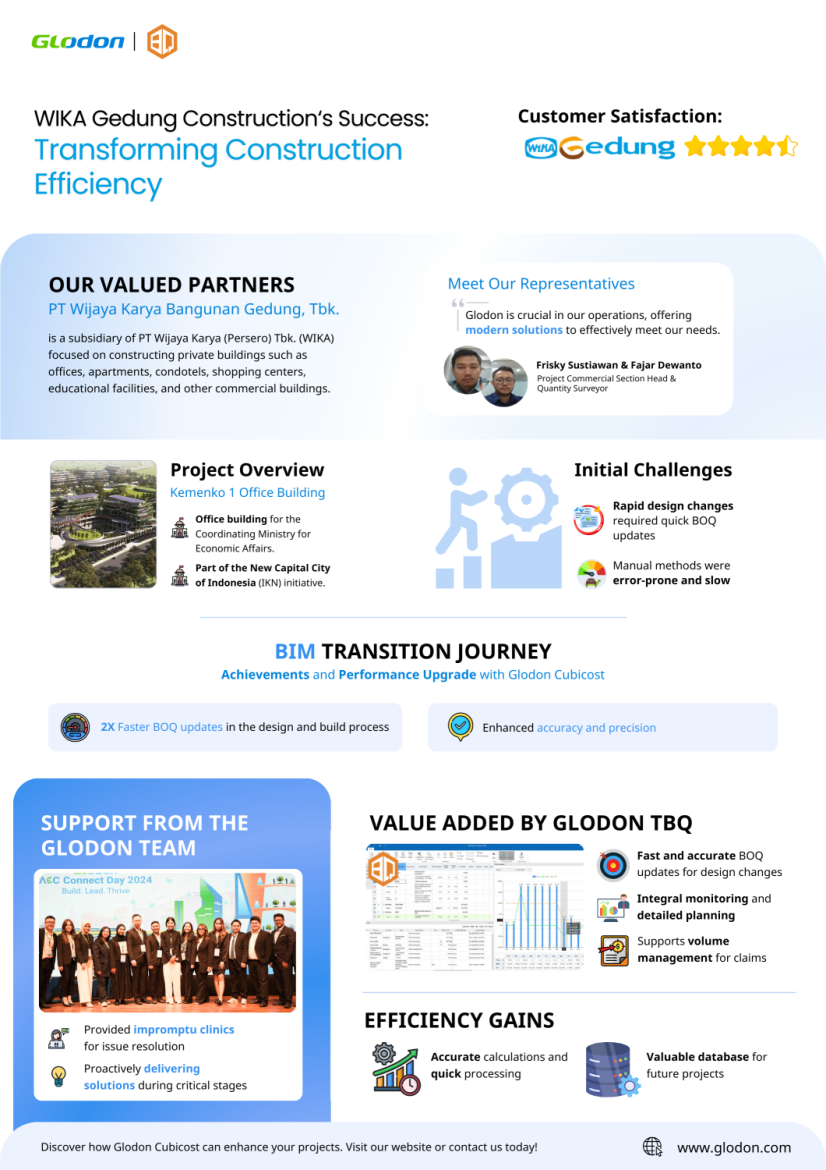 We are thrilled to share an inspiring success story from PT Wijaya Karya Bangunan Gedung Tbk (WIKA Gedung), a leader in Indonesia’s construction sector. WIKA Gedung has set a new benchmark in the industry by implementing Glodon Cubicost’s BIM 5D solutions to achieve remarkable efficiency and precision.